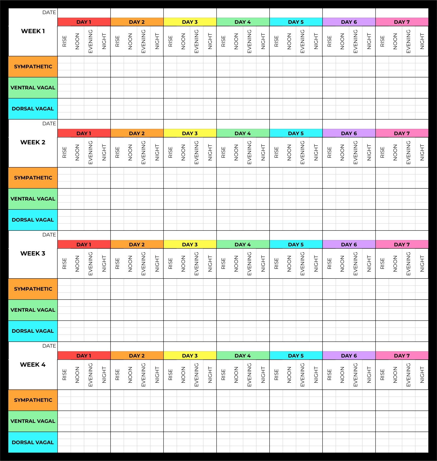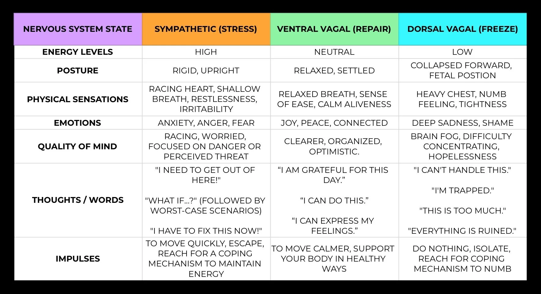 Make a list of the tools that help you in each state. These tools could be orienting to your environment when in Dorsal Vagal, doing a somatic exercise in Sympathetic, or enjoying time with a loved one in Ventral Vagal.